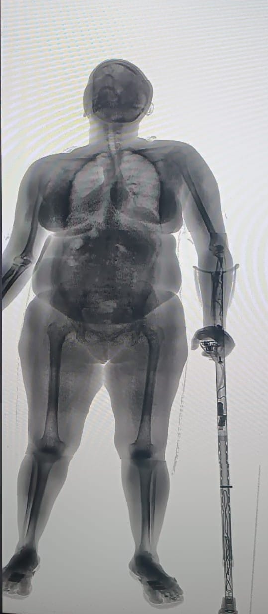 Uma mulher foi flagrada tentando ingressar na Cadeia Pública de Salvador com drogas e aparelhos eletrônicos ocultos em uma muleta e no chinelo na tarde desta quarta-feira (7). A ação foi interceptada durante o procedimento de revista com o BodyScan, equipamento de raio-X que identificou os objetos proibidos.